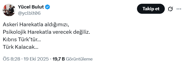 MHP Tokat Milletvekili Yücel Bulut, sosyal medya hesabından yaptığı paylaşımda, “Askeri harekatla aldığımızı, psikolojik harekatla verecek değiliz. Kıbrıs Türk’tür… Türk Kalacak…” ifadelerini kullandı.