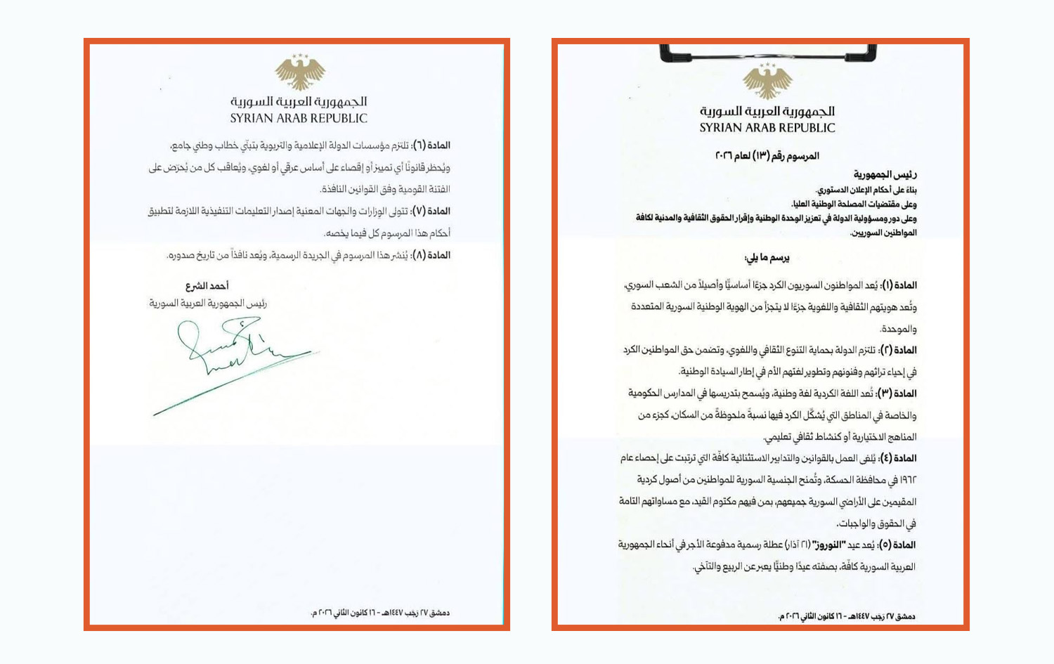 Resmi haber ajansı SANA’da bugün yayımlanan kararname, Suriye’nin yeni ulusal kimliğini “çok kültürlü ve birleşik” olarak tanımladı. Kararnamede, Kürtlerin Suriye toplumunun ayrılmaz bir parçası olduğu vurgulandı.