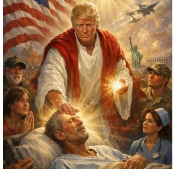 Görselde kendisine dua eden ve hayranlıkla bakan kişilerin arasında resmedilen Trump, hasta yatağındaki kişiyi iyileştiriyormuş gibi tasvir ediliyor.