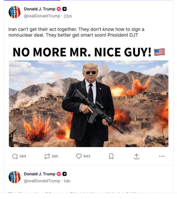 ABD Başkanı Donald Trump, sosyal medya platformu Truth Social üzerinden paylaştığı bir görsel ve mesajla İran yönetimine yönelik tonunu sertleştirdi. Trump, paylaştığı mesajda artık “kibar davranmayacağını” belirterek Tahran’ı bir an önce karar vermeye çağırdı.