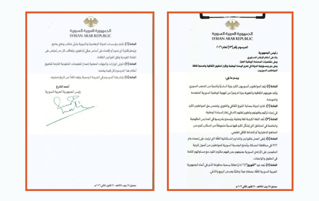 Suriye Geçici Cumhurbaşkanı Ahmed Şara, imzaladığı kararnameyle Kürtlere ilişkin bir dizi önemli düzenlemeyi yürürlüğe koydu. Kararnameye göre Kürtçe ulusal dil olarak kabul edilirken, Newroz Bayramı resmî tatil ilan edildi. Ayrıca Suriye topraklarında